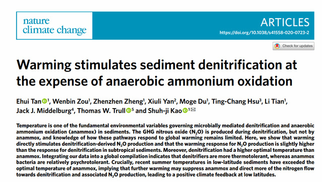3月23日,地学领域顶级期刊《自然·气候变化》(Nature Climate Change)在线发表了近海海洋环境科学国家重点实验室“海洋氮循环与全球变化”创新研究群体、氮循环课题组的最新研究成果,题为Warming stimulates sediment denitrification at the expense of anammox,揭示了气温升高将以抑制厌氧氨氧化为代价刺激沉积物反硝化,加剧全球变暖。