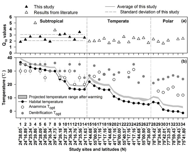 图2全球尺度上不同纬度下反硝化过程Q10值,反硝化与厌氧氨氧化过程最适温度及其环境原位温度的纬度变化。横坐标表示不同的研究文献及研究区域的纬度。