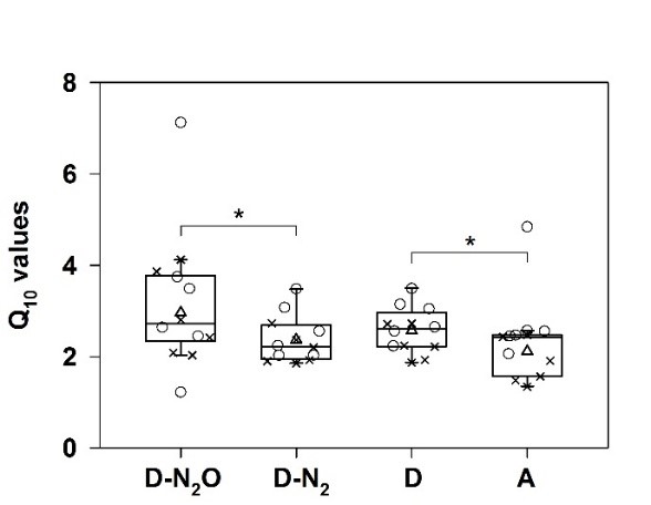 图1 反硝化过程中N2O释放,N2释放以及反硝化与厌氧氨氧化四个过程Q10值比较。D-N2O,D-N2,D和A分别表示反硝化介导的N2O释放,N2释放,反硝化和厌氧氨氧化过程。叉叉和空心圆圈分别表示夏季和冬季数据。* p<0.05。