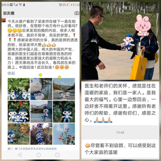 3月7日,当得知厦大研制的福建省首个新冠病毒检测试剂盒获准上市的消息后,观察区入住人员纷纷转载点赞,“抗疫战场立奇功,科技报国挺脊梁!我骄傲,我是厦大人!”来自化学化工学院的余同学在朋友圈中写道。