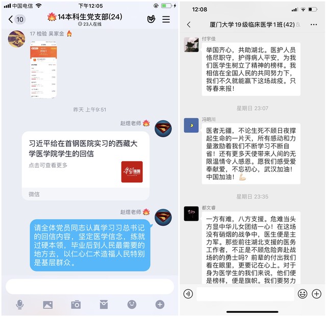 当前正处于新冠肺炎疫情防控的关键时刻,医学院、公共卫生学院和药学院党委第一时间组织全体学生党员团员通过线上学习形式,引导医学生认真学习习近平总书记回信精神,牢记嘱托,学好本领,奉献祖国,服务人民。习近平总书记的回信迅速在医学生中引发热烈反响,同学们纷纷在平台上留言,畅谈自己的学习体会。
