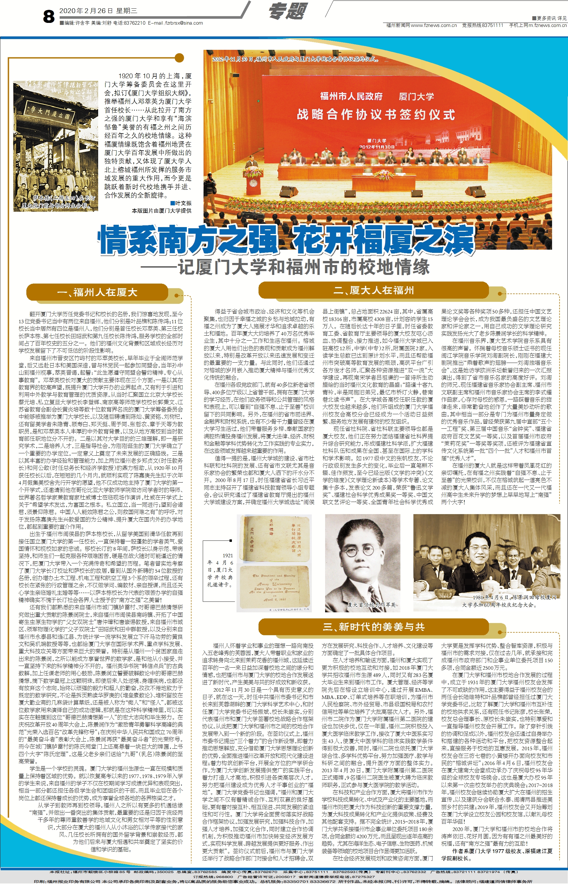 1920年10月的上海,厦门大学筹备委员会在这里开会,拟订《厦门大学组织大纲》,推举福州人邓萃英为厦门大学首任校长……从此拉开了南方之强的厦门大学和享有“海滨邹鲁”美誉的有福之州之间历经百年之久的校地情缘。这种福厦情缘既饱含着福州地贤在厦门大学百年发展中所做出的独特贡献,又体现了厦大学人北上榕城福州所发挥的服务市域发展的重大作用,而今更是跳跃着新时代校地携手并进、合作发展的全新旋律。