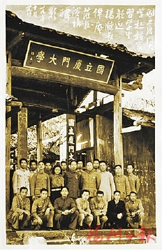萨本栋(二排左四)在长汀厦大校门前与部分师生合影