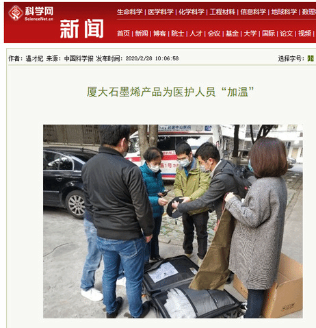 2月28日,科学网刊发《厦大石墨烯产品为医护人员“加温”》,报道我校嘉庚创新实验室团队——厦门大学化学化工学院教授郑南峰、萨本栋微纳米研究院副教授吴炳辉,运用课题组前期的一项研究成果——柔性石墨烯加热膜产品,在低温阴天给医护人员带来健康保障。