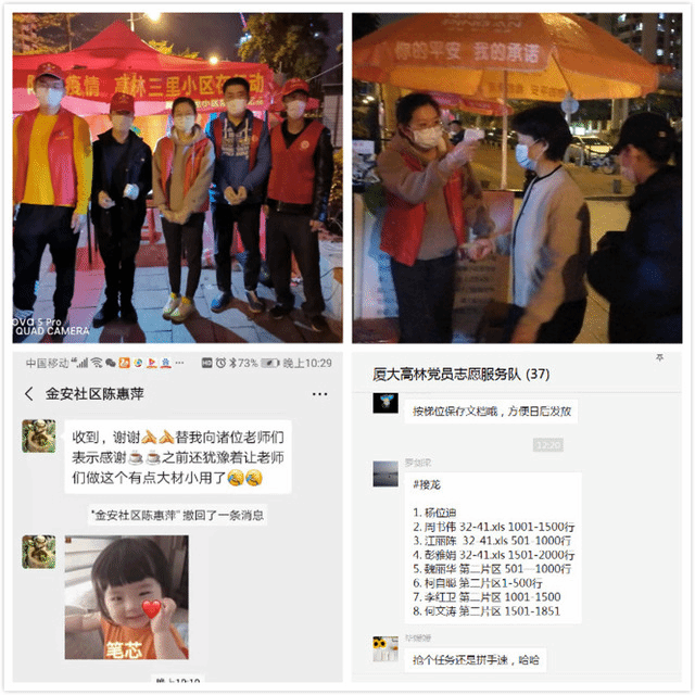 “抢个任务还要拼手速。”金安社区厦大党员志愿者在群里调侃道。金安社区党员志愿服务队组建以来,社区有需要,群里37位党员都第一时间响应。2月12日开始,党员志愿服务队就协助社区制作出入证,在12位教工党员共同配合下,一个下午就帮助社区完成8000多条住户信息处理。2月14日,学校教职工正式上班后,党员志愿者们也充分利用下班和周末时间配合社区在门岗测量体温、发放小区出入证、维持居民出入秩序。