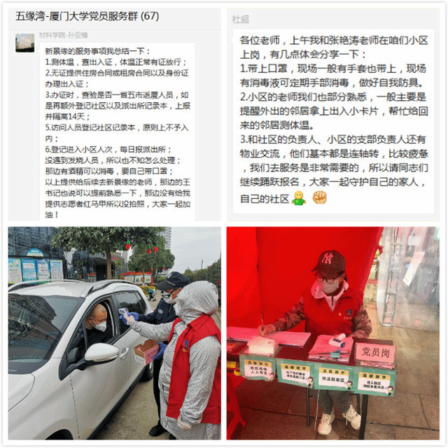 上李社区56名党员也迅速加入社区志愿服务工作,拟定第一阶段2月15日至23日排班,协助该社区3个小区入口的体温检测工作。2月15日志愿服务第一天,后勤集团副总经理王裕民带头投入小区防疫一线,谈及志愿服务感受,他说:“作为一名党员干部主动参与社区新冠肺炎疫情防控工作是义不容辞、责无旁贷!”在前埔社区党员志愿队微信群中,志愿者们就“测到体温偏高者如何现场处理”“如何提高居民接受测量体温配合度”等问题展开热烈交流。志愿者们一手复工、一手抗疫,在厦大紧锣密鼓开展线上教学的同时,利用课余时间守卫好社区卡口,不辞辛劳、毫不懈怠。马克思主义学院党委书记侯利标、外文学院党委书记陈志伟、经济学院副院长朱孟楠等党员领导干部以身作则、率先垂范,在2月16日降雨降温的恶劣天气里坚守卡口开展工作,既是“最强阵容”,也是“服务典范”。