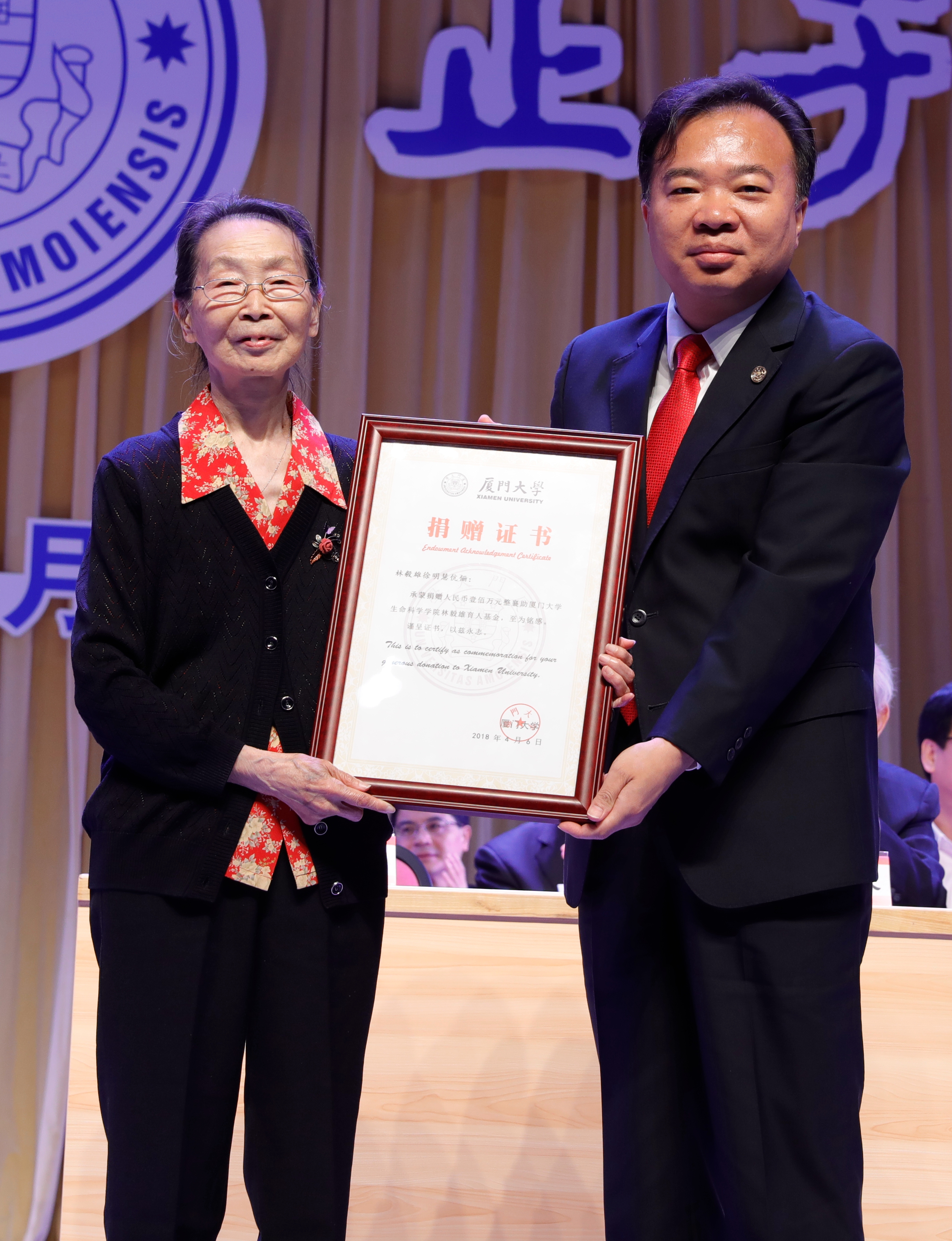 2018年,厦门大学97周年校庆。徐明慧(左)替丈夫林毅雄捐赠百万设立基金。