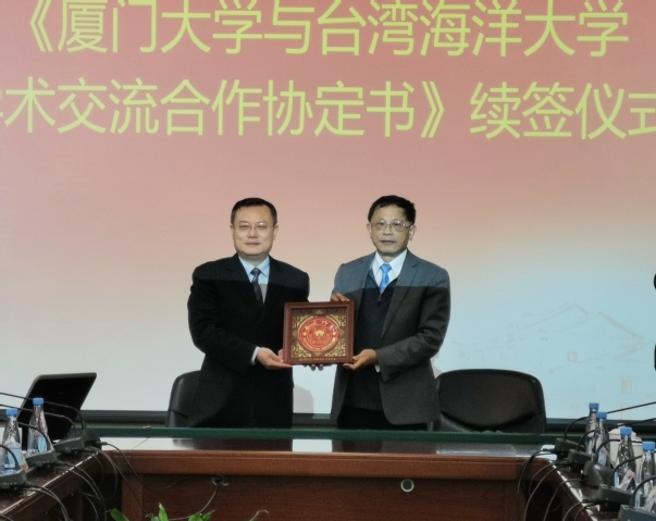 张荣、张清风代表双方续签《厦门大学与台湾海洋大学学术交流合作协定书》。