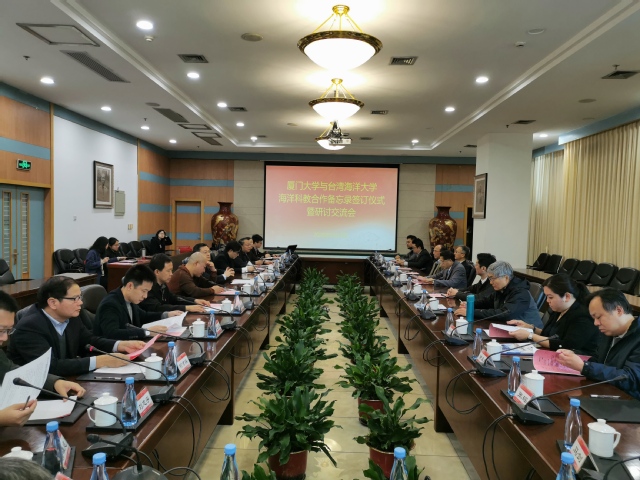 1月15日早上,厦门大学与台湾海洋大学海洋科教合作备忘录签订仪式暨研讨交流会在主楼215会议室举行。台湾海洋大学校长张清风,台湾海洋大学海洋中心主任陈天任,我校校长张荣,中国科学院院士、地球科学与技术学部主任戴民汉,翰名教育科学基金会主席、知名校友萧恩明出席签订仪式。海洋与地球学院院长王克坚主持仪式。