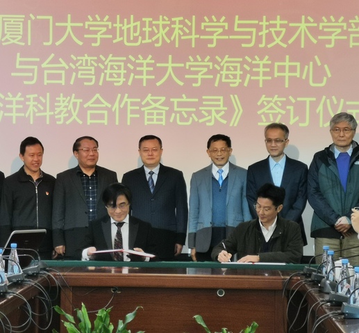 戴民汉、陈天任代表双方签订《厦门大学地球科学与技术学部与台湾海洋大学海洋中心海洋科教合作备忘录》。