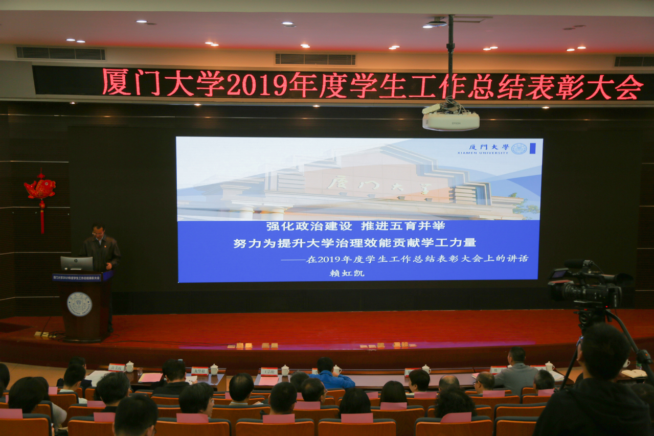 1月12日,我校召开2019年度学生工作总结表彰大会。校党委副书记赖虹凯,关工委主任陈力文,党委常委、漳州校区党工委书记、管委会主任、嘉庚学院党委书记林辉,关工委副主任杨敬达、黄福才,组织部、保卫部(处)、统战部、研究生院、教务处、资产与后勤事务管理处、国际处等部门、陆军驻厦门大学后备军官选培办、马克思主义学院、嘉庚学院相关负责同志,各学院、研究院、教学部分管学生工作的负责同志,全体专职和储备辅导员,以及学生工作部(处)、校团委的全体工作人员参加了会议。