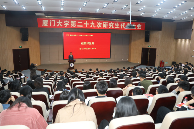 12月15日,我校第二十九次研究生代表大会在翔安校区德旺图书馆二号报告厅召开。校党委副书记赖虹凯,福建省学联主席李雨潼,共青团福建省委学校部副部长陈世景,组织部、宣传部、统战部、学生工作部、翔安校区党工委、保卫部、研究生院、校团委负责人及各学院党委、团委负责人出席大会开幕式,北京大学、南开大学等兄弟高校研究生会发来贺信。