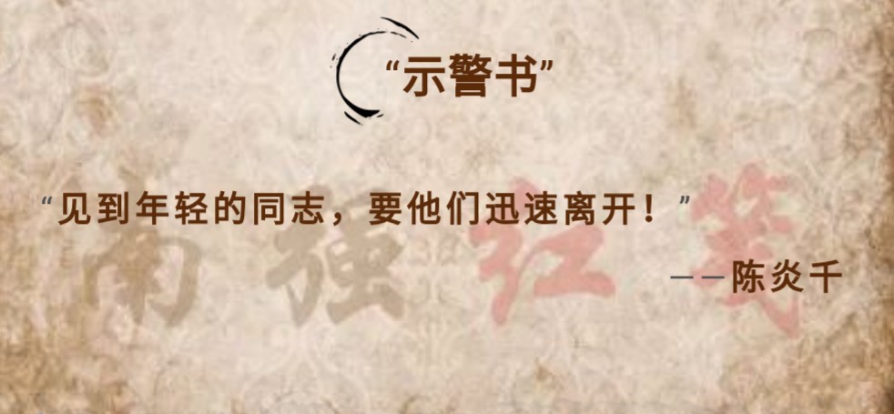 1949年8月31日,国民党宪兵和特务包围厦大校园,陈炎千等十几位地下党员和革命群众被捕。深知自己难以逃脱的陈炎千面对敌人的严刑拷打,始终坚守着自己的浩然正气,从容无惧,在极其危难时刻,还千方百计地向革命战友传递“迅速离开”的“示警书”,为革命挽回重大损失。9月14日,陈炎千壮烈牺牲,年仅26岁。