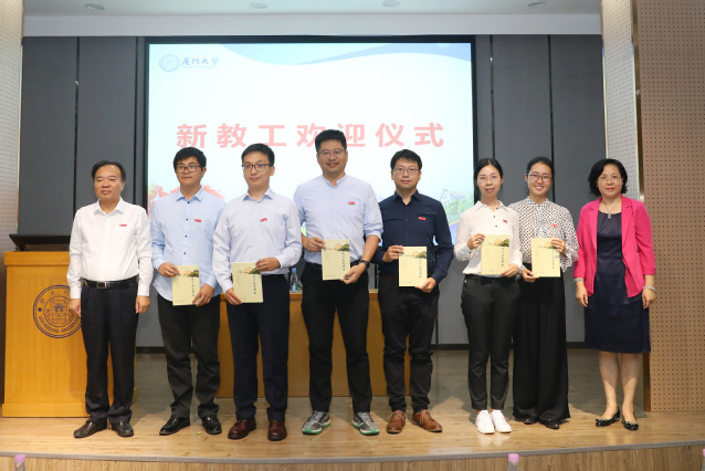 伴随着充满青春活力的男女声合唱《扬帆未来》的歌声,张彦、邓朝晖为新教工代表佩戴校徽,并赠送《我的厦大老师》一书。