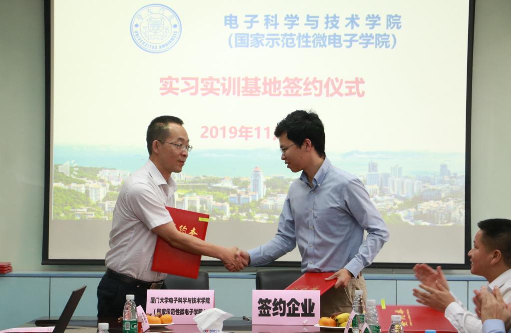 为促进电子信息领域人才培养,提高学生服务产业的能力,厦门大学电子科学与技术学院(国家示范性微电子学院)与龙芯中科技术有限公司、杭州海康威视数字股份有限公司、锐捷网络股份有限公司、福州瑞芯微电子股份有限公司、福建联迪商用设备有限公司、新大陆支付技术有限公司、厦门信息集团有限公司、厦门海沧信息产业发展公司、厦门市美亚柏科信息股份有限公司、厦门市三安集成电路有限公司、联芯集成电路制造(厦门)有限公司、厦门优迅高速芯片有限公司、厦门信和达电子有限公司、厦门士兰集科微电子有限公司、厦门通富微电子有限公司、厦门云天半导体科技有限公司、立达信物联科技股份有限公司、宏泰机电科技(厦门)有限公司、深圳信步科技有限公司、深圳市浩源光电技术有限公司这20家单位签订了实习实训基地合作协议。通过实习实训基地平台,学生可以参与企业生产实践,熟悉企业生产环节,感受企业文化氛围,积累工作经验,提高就业竞争力。在此基础上,企业和学生可以进行双向选择,有效缩短了人才选拔周期,节约招聘成本,从而实现企业选拔高素质人才与学生成功就业的双赢。