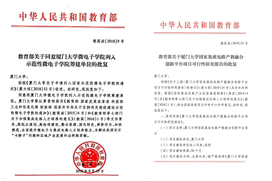 2019年5月,教育部下发《教育部关于厦门大学国家集成电路产教融合创新平台项目可行性研究报告的批复》(教发函〔2019〕14号),正式批复同意厦门大学承建“国家集成电路产教融合创新平台”。学校将以此为契机,不忘“立德树人”初心,牢记“培育人才”使命,聚焦国家集成电路领域“卡脖子”问题,加快集成电路领域关键核心技术攻关,加强集成电路领域专门人才培养,推进海西经济区集成电路产业升级,带动海峡西岸集成电路产业与人才聚集,为福建省和厦门市半导体集成电路产业发展提供人才和技术支撑。