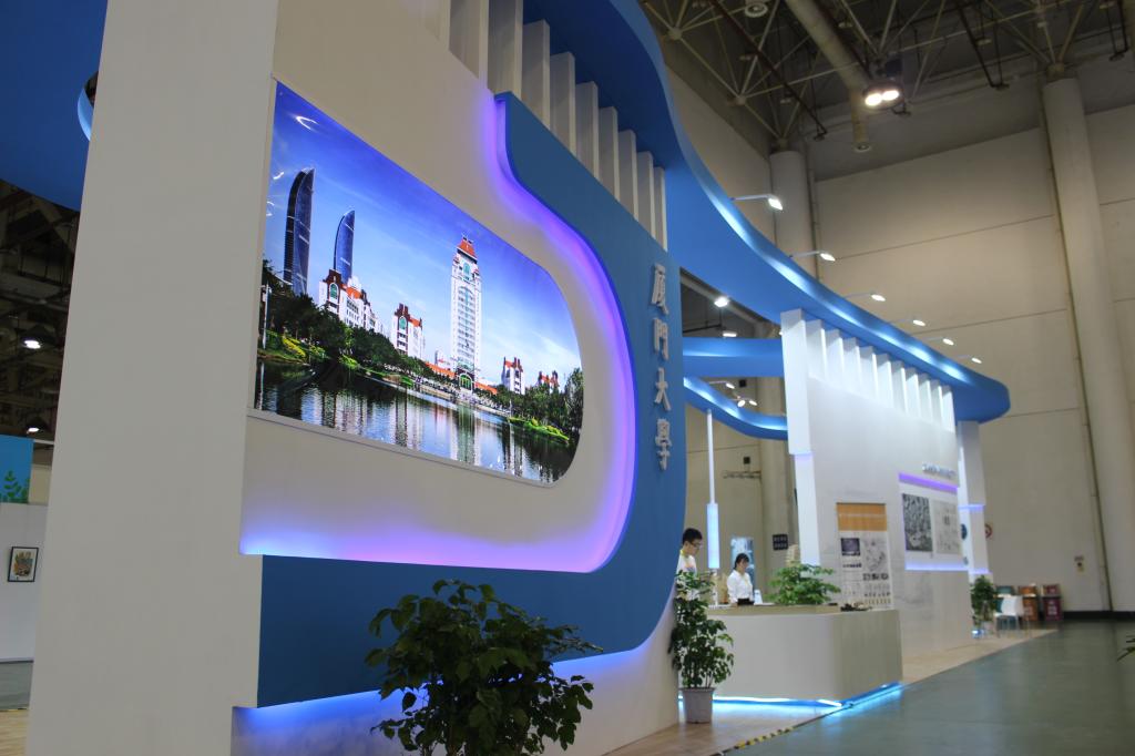 由我校建筑与土木工程学院本科生自主设计的展厅以“流动”为基本理念,用轻薄的曲线和格栅塑造出轻盈优雅的形体。展厅外观如同一汪自由流动的清泉,既象征着厦门大学傍水而居的独特地理位置,又体现了学校浪漫自由、创新进取的学风。展厅运用了厦大蓝、嘉庚体等厦大元素进行装饰,充分展示了我校美好的形象和磅礴气势,成为文博会现场一道靓丽的风景。