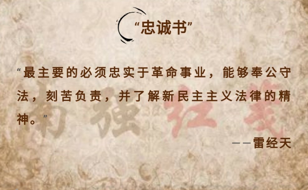这是雷经天在《新民主主义的司法制度》中提出的司法干部选用条件,这既展现了雷经天对党矢志不渝的真挚感情,也是雷经天一生忠于革命事业的真实写照。