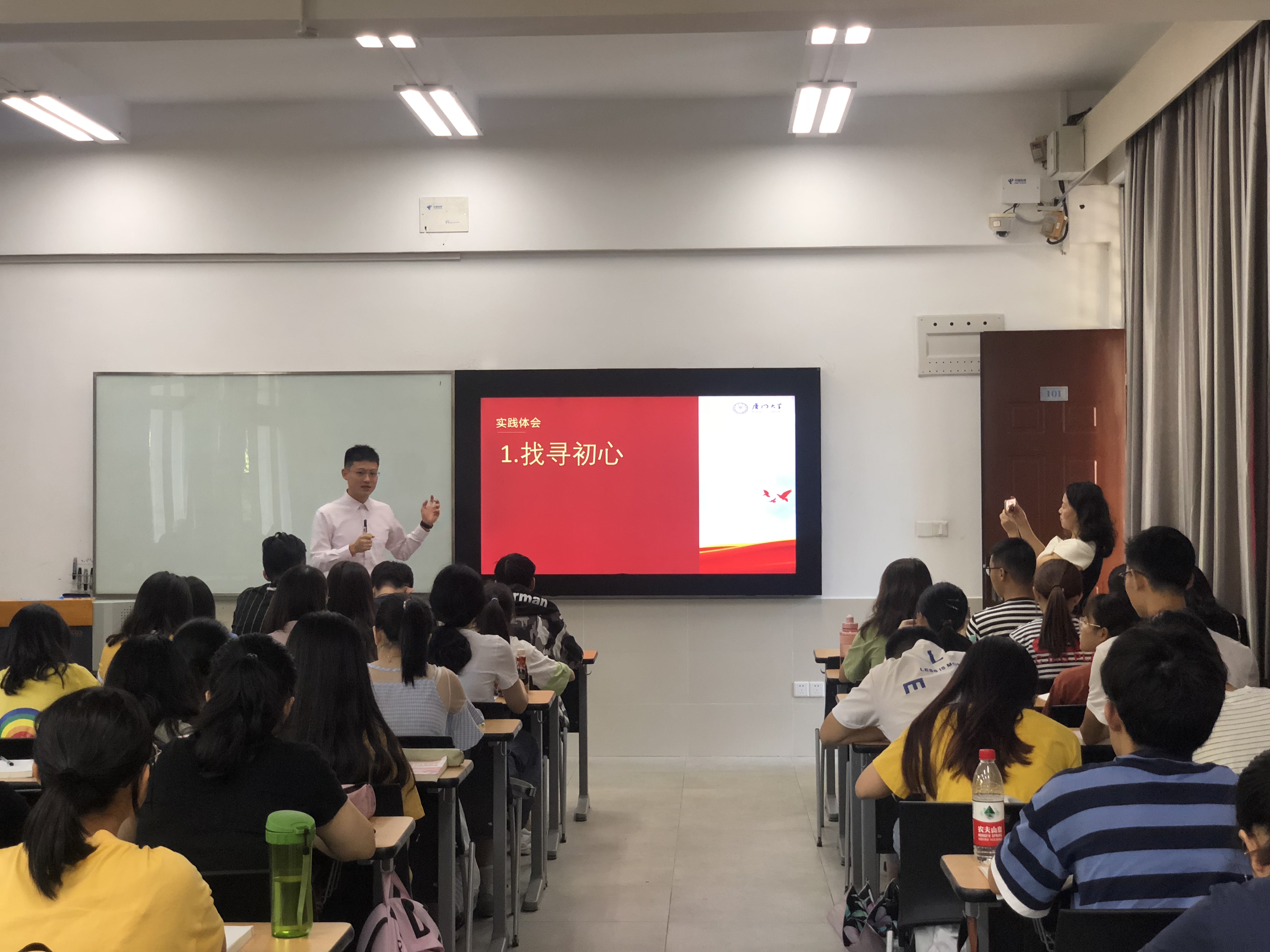 9月19日,在南强二405教室“毛泽东思想和中国特色社会主义理论体系概论”的第一课,迎来了一位“青春小讲师”,他就是厦门大学暑期实践队“追寻总书记足迹,不忘初心,跟党走”队员代表、管理学院会计系2018级本科生石昆达。他以“初心”为主题,将队员们在福鼎赤溪村、长汀中复村、上海一大会址和嘉兴南湖纪念馆四地社会实践的所见所闻一一展示,受到同学们的热烈欢迎。