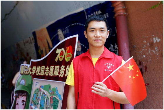 这是来自王亚南经济研究院2018级研究生郑宇琪一天中听到最多的问题。她表示,作为国庆假期校园服务站的志愿者,其使命和任务是帮助和引导游客更顺利地游览和更深入地认识美丽的厦门大学。并且适逢新中国七十华诞,作为此次活动唯一的研究生志愿者,她更加感受到了非凡的意义和责任。她说,无论是邀请游客参与“我与国旗合个影”的活动,还是向游客解答“芙蓉隧道怎么走”、“哪里可以购买厦大纪念品”,甚至有关在厦大的学习生活等问题,都让自己感受到内心满满的激动。