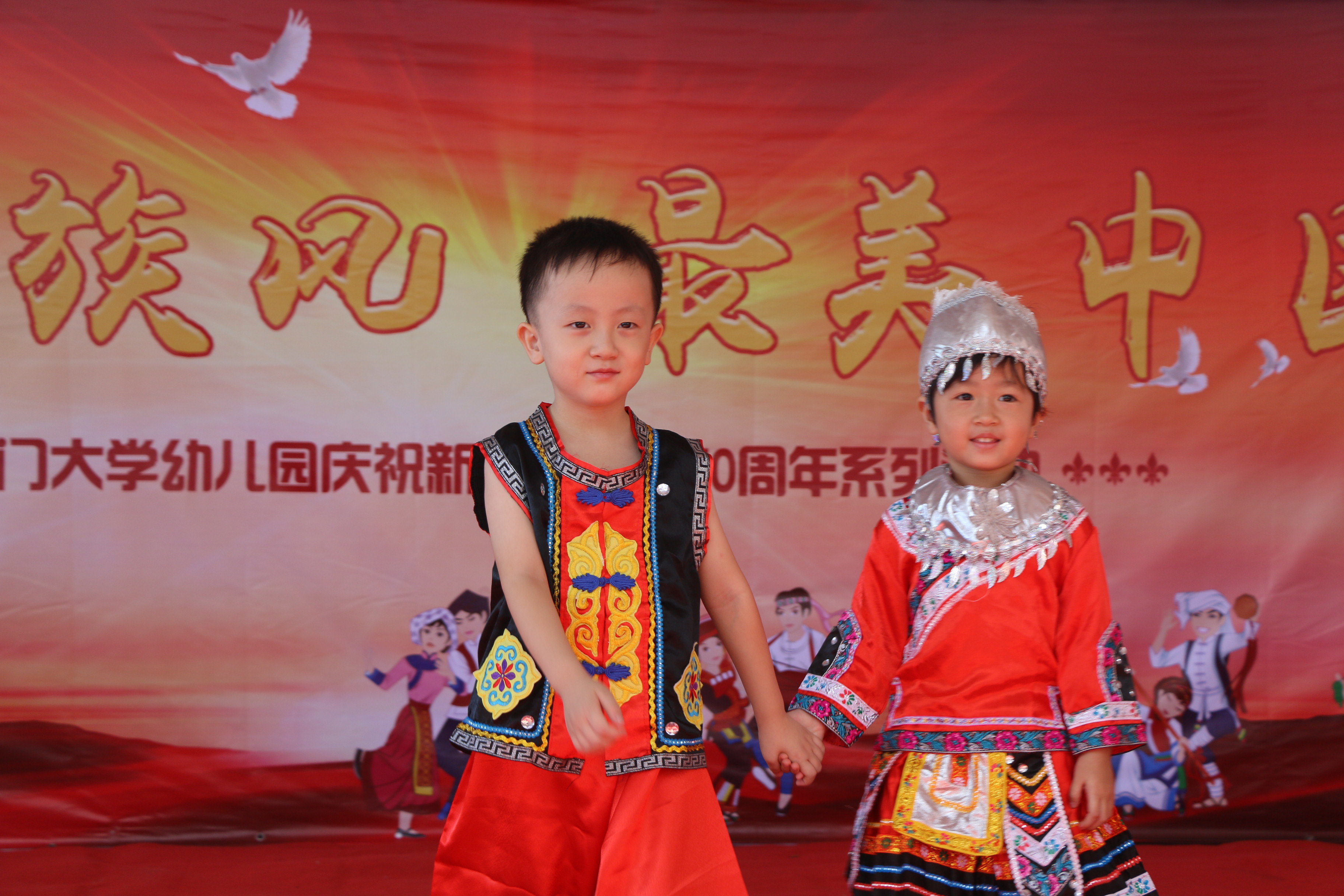 ——民族服装秀,祖国一家亲。台上,孩子们身穿不同民族的服装,化身为勇敢豪放的蒙古族小娃、轻盈灵动的维吾尔族女孩、可爱帅气的满族小阿哥……和着具有民族特色的音乐,正神气地走来。孩子们在亲身参与、快乐体验中,知道了中国地大物博,有着五十六个民族的兄弟姐妹,大家共同生活在祖国这个大家庭中。