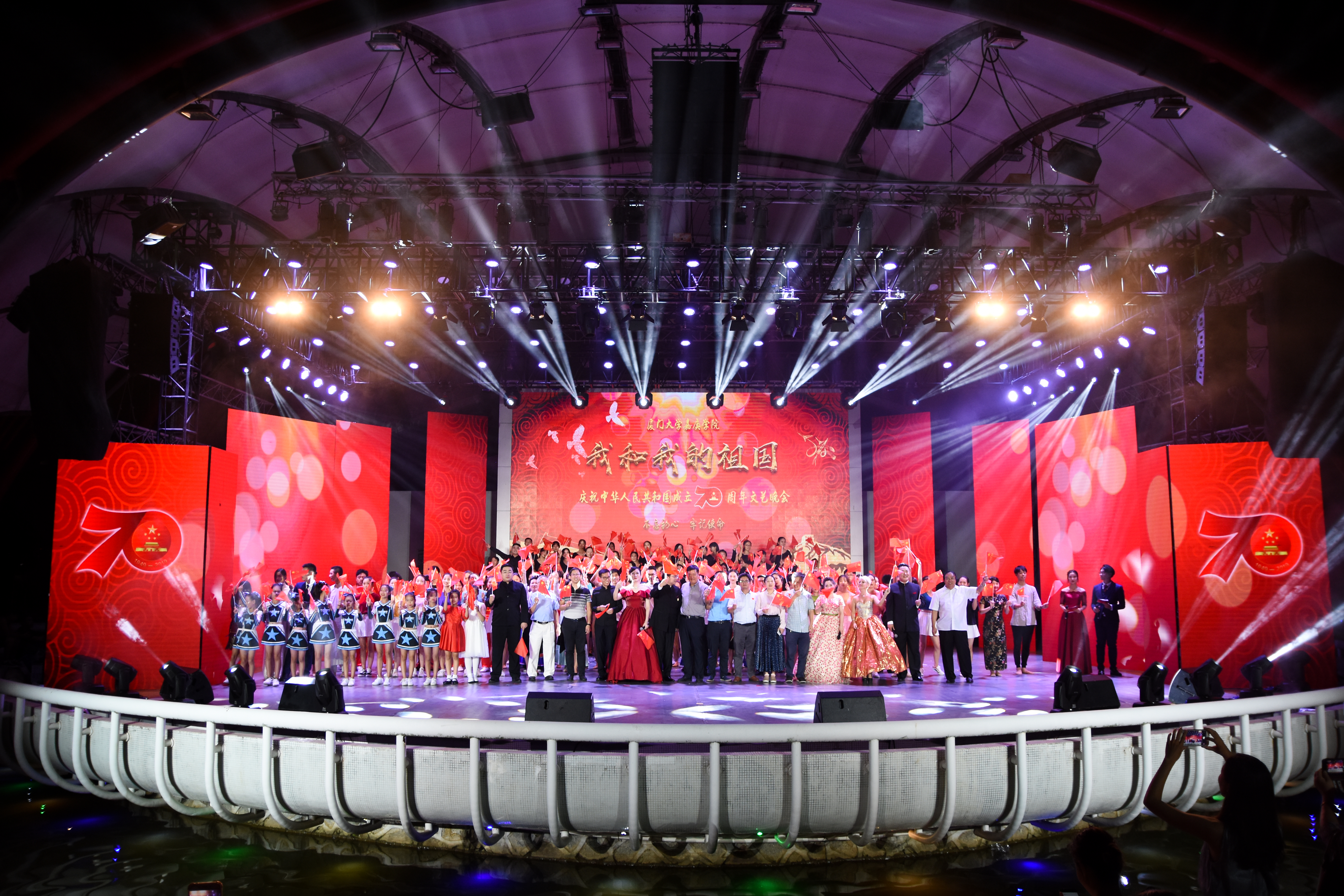 9月22日晚上,厦门大学嘉庚学院“我和我的祖国”庆祝中华人民共和国成立70周年文艺晚会在漳州校区水上音乐广场举行。嘉庚学院师生、厦门大学附属实验小学学子、厦门大学嘉庚学院幼儿园萌娃、归国学子、外国友人在同一个舞台,用各自的方式表达对新中国的爱。