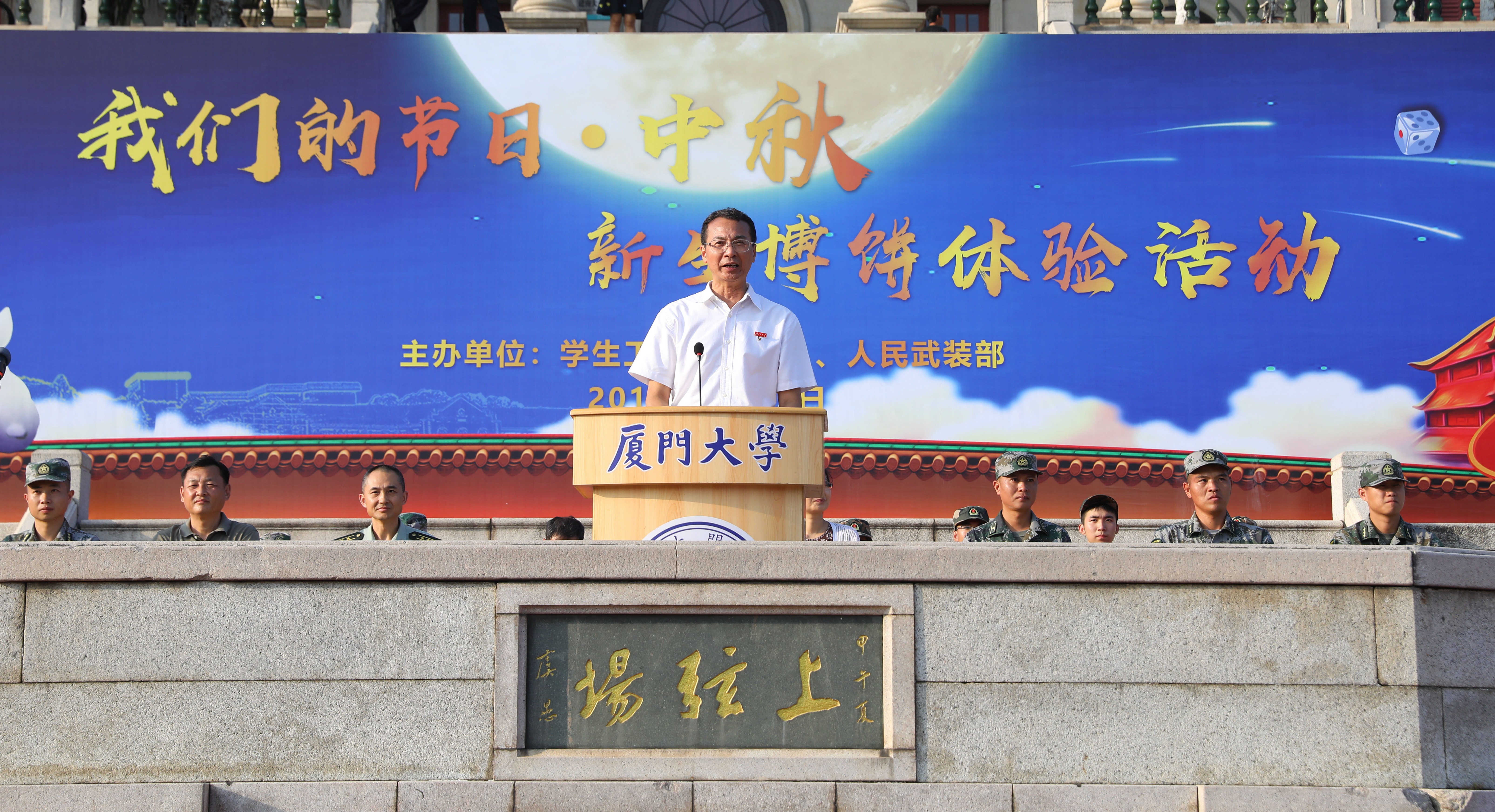 今年的新生军训恰逢中秋假期,15日下午,我校在思明校区、翔安校区同时举行“我们的节日•中秋”新生军训博饼体验活动,赖虹凯代表学校向师生、教官送上了节日的祝福。上千名新生与来宾、教官在训练场一同体验具有闽南地方特色的民俗活动,感受军民鱼水情。
