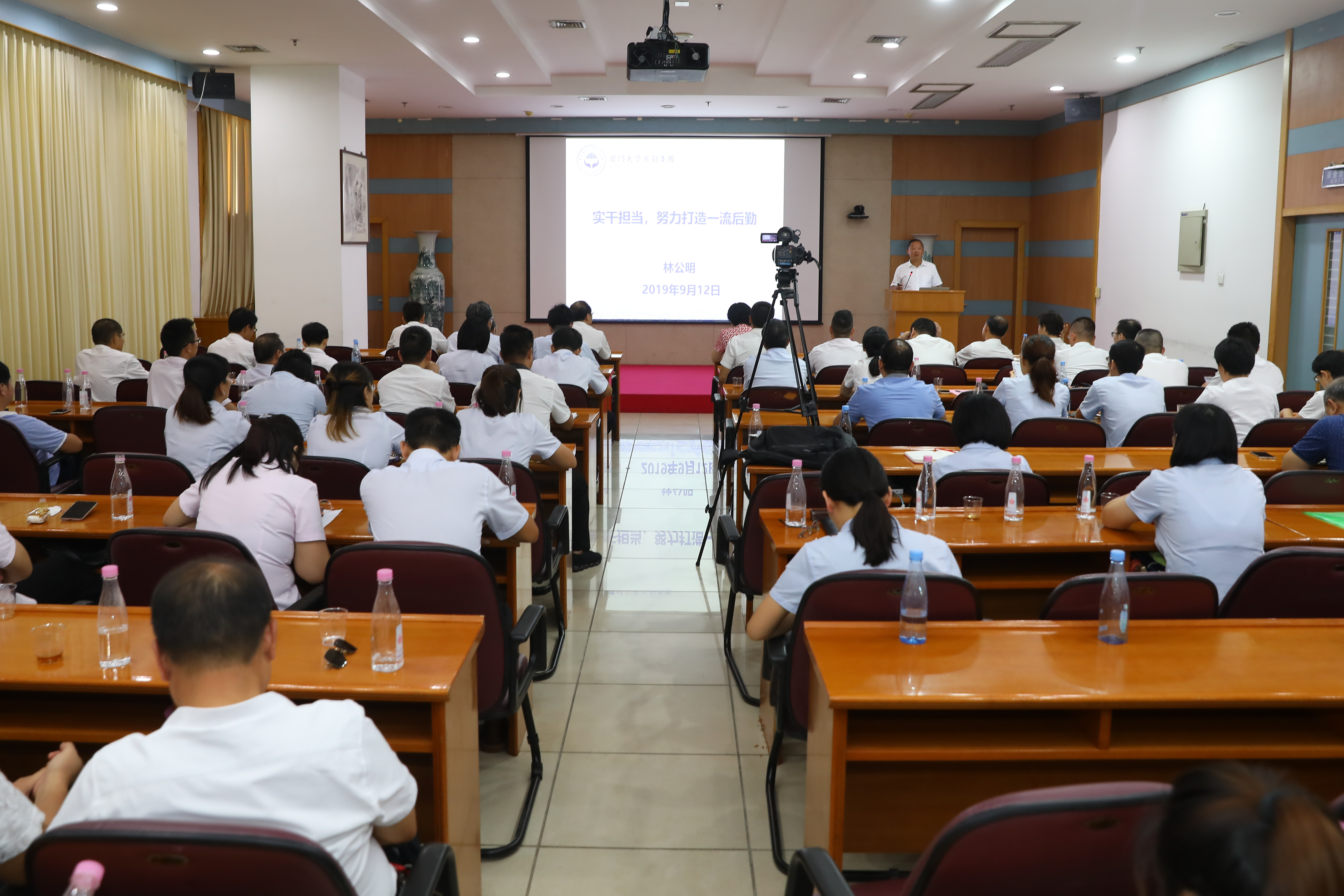 邓朝晖指出,后勤工作是学校管理工作的重要组成部分,是学校教学、科研和师生学习生活顺利进行的基础和保障,是确保学校安全与稳定的重要环节,更是做好“三全育人”的重要阵地,学校党委非常重视后勤管理工作,注重发挥后勤的服务育人职能。她结合学校召开的“不忘初心、牢记使命”主题教育动员部署会的精神提出了四点要求:一是要坚守初心;二是要勇担使命;三是要勤找差距;四是要狠抓落实。