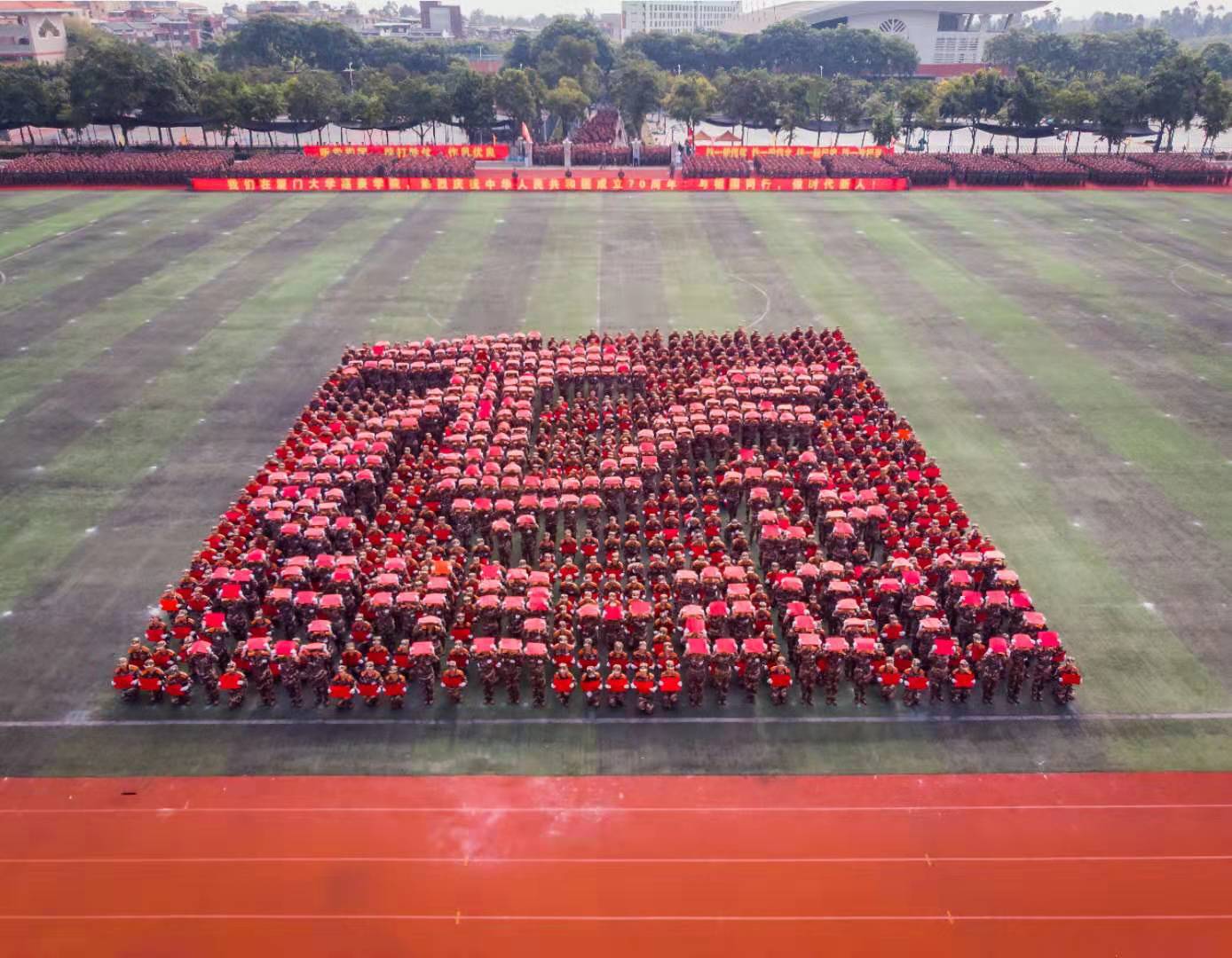 今年是新中国成立70周年,嘉庚学院新生以颇具新意的队形表演庆祝中华人民共和国成立70周年。在队形变换表演中, 900名新生高举中国红纸片,组成了“I❤CHINA”、中国地图、国旗、“2003TKKC”、“2019 TKKC”、“嘉”等图样。队形表演之后,还有健身操与旗语、匕首操与格斗术和班进攻战术等表演,充分展现了嘉庚学子的风采。