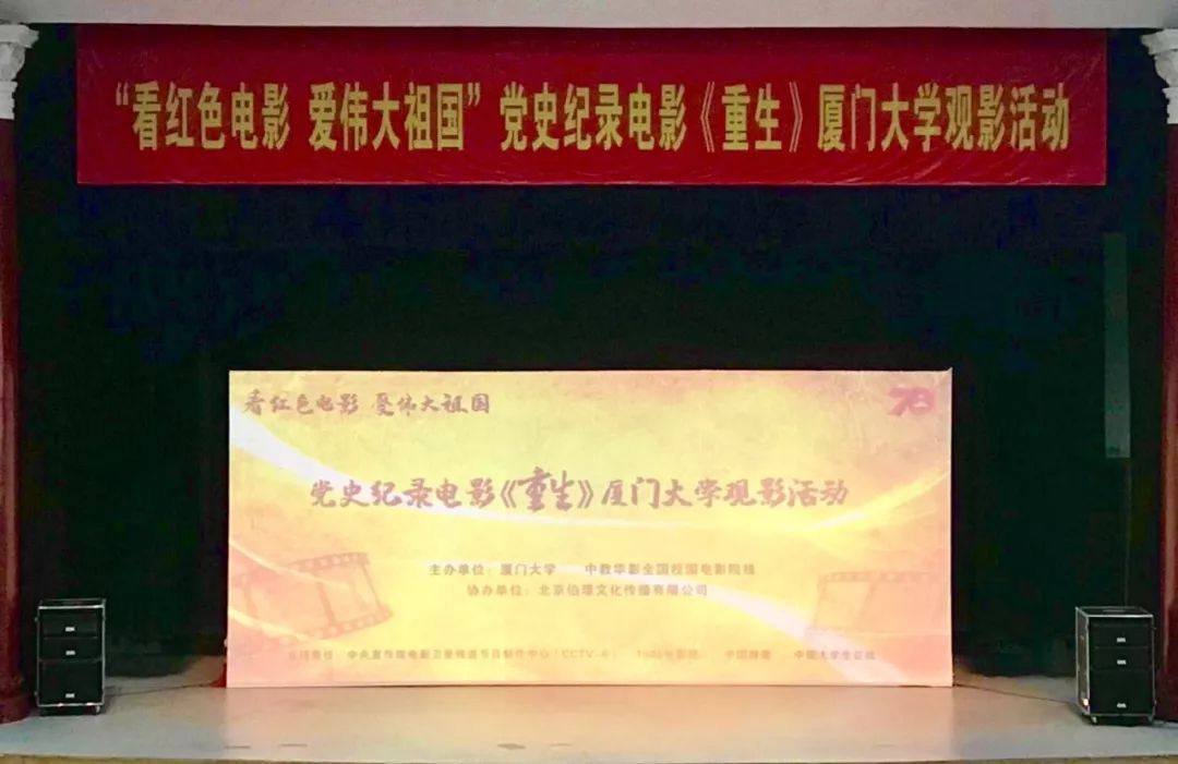 9月11-16日,适逢中秋佳节,厦门大学思明校区、翔安校区,以及嘉庚学院2019级万名新生观影党史纪录电影《重生》,“看红色电影,爱伟大祖国”优秀电影进校园活动燃爆全场。校党委副书记赖虹凯,校党委常委、宣传部部长徐进功,中教华影全国校园电影院线总经理熊殷博士,以及学生工作部、人民武装部、人文学院等相关负责人出席了活动。