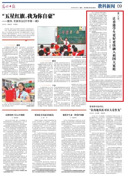 9月3日《光明日报》第九版(教科新闻)刊发题为《厦门大学:让香港学生更好更快融入祖国大家庭》的深度通讯,报道学校通过一系列暖心的举措,帮助香港学生更好更快地适应在校学习生活,更好更快地融入祖国大家庭。文章说,“厦门大学是香港学生赴内地求学的热门高校之一。近年来,学校对港招生规模有所上升,生源质量不断提高。”