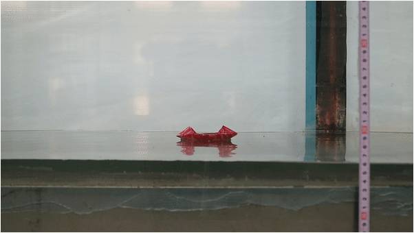 该论文中,通过控制不同位置的水深来实现渐变折射率分布,再结合波导理论,设计了一种基于水波模式转换的宽带水波波导隐形装置,并且在大型波浪水槽中实测验证了它的有效性。水槽长60m,宽1.2m,高2m。渐变折射率超材料位于水槽底部两侧,由薄铁板制成,长为6m,宽为0.15m,分为三个区域,包括两个对称的弯曲形状部分和一个扁平形状的部分。实验中,水槽中水深为15-18cm,将一艘小船放置在该波导中心,在水波频率为0.6-0.9Hz时,小船在肉眼看起来几乎是固定不动的。这是因为小船位于水波“隐形”区域,由于渐变超材料的存在,引导水波绕开波导中心传播,使得波导中心区域内的物体免受水波的影响。另一方面,当将小船漂浮在渐变超材料上方时,由于水波能量汇聚在此处,使得小船的摇曳晃动加强。通过优化结构参数可以应用于不同的波浪环境,获得更大的隐形区域。