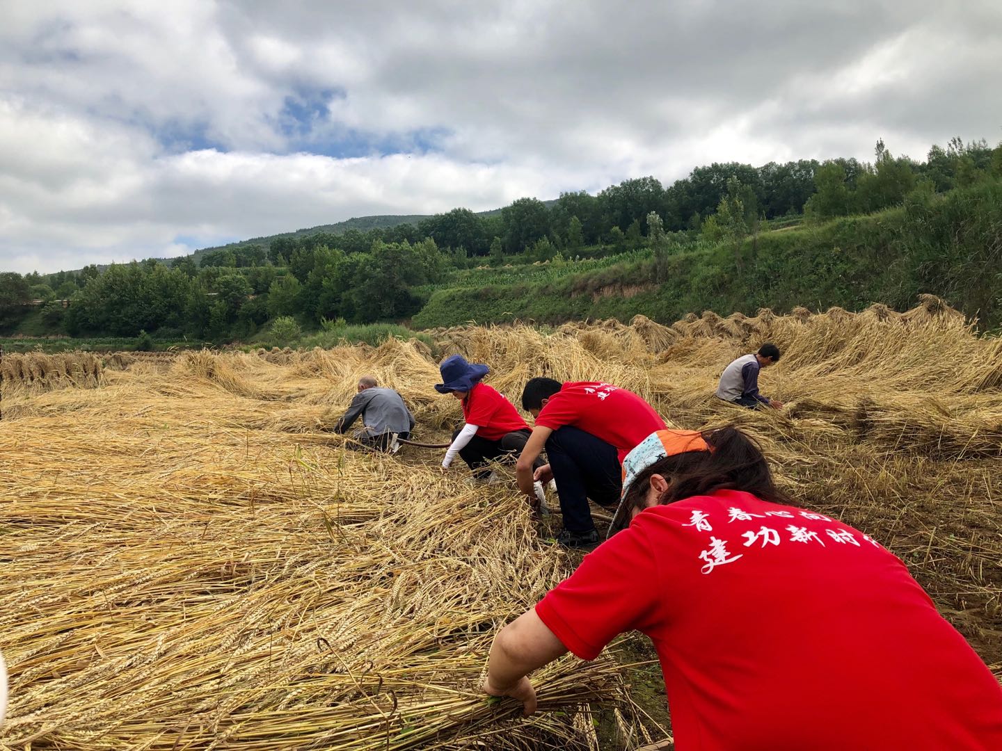 恰逢隆德县麦子丰收的季节,田野间,麦子金黄饱满,如同一个个笑得咧嘴的娃娃。这是大部分队员第一次见到真实的麦田,别说下地干活了,许多同学连水稻和麦子都“傻傻分不清”。好在老乡也不嫌弃这些城里“娃娃”,从如何拿镰刀、抓麦秆,到贴地收割、捆扎麦把,都耐心地传授“技巧”,队员们也学得用心,俯下身子认真干。
