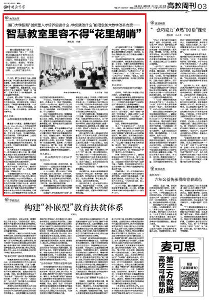 近日,《中国教育报》刊发题为“智慧教室里容不得‘花里胡哨’”的通讯文章,以大半个版面的篇幅深入报道我校近年来围绕“创新型人才培养需要”所进行的教学改革及取得的成效。