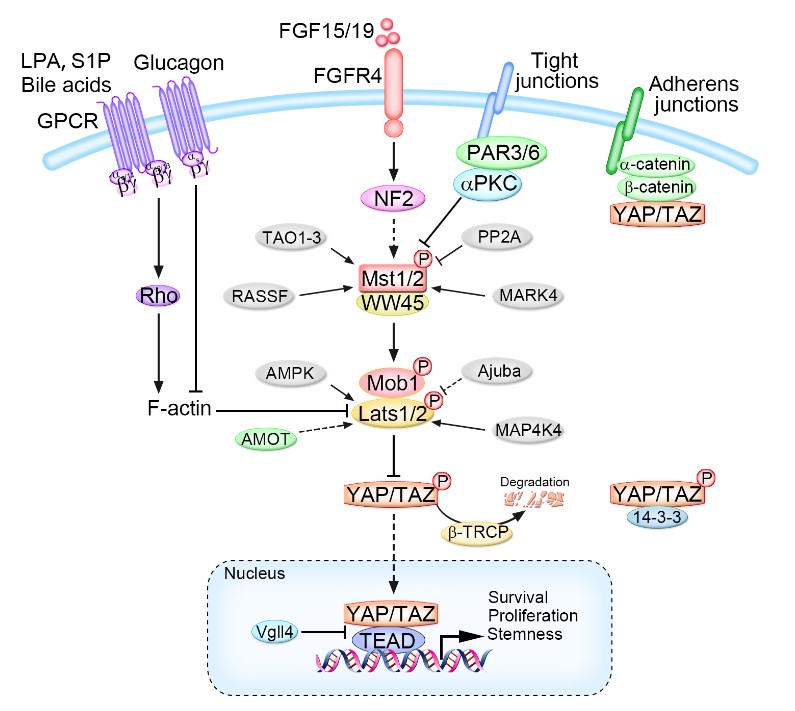 Hippo信号转导是一条进化上非常保守的通路,可通过调控细胞增殖、凋亡及干细胞自我更新来控制器官组织再生与尺寸大小。该通路失调导致器官持续性增生及肿瘤炎症等重大疾病发生发展,因此该通路调控机理研究是再生医学与肿瘤炎症疾病领域的前沿热点。YAP/TAZ转录共激活因子是Hippo信号通路关键效应分子,其活性主要通过Mst1/2-Lats1/2激酶级联反应磷酸化调控。磷酸化的YAP/TAZ滞留在胞质而无法行使转录激活功能,相反,非磷酸化修饰的YAP/TAZ能够进入细胞核,调控一系列促增值、抗凋亡及细胞干性相关基因的表达(图一)。同时,YAP/TAZ是一个重要的致癌蛋白,YAP/TAZ过高表达或细胞核定位在多种肿瘤(如肝癌、肠癌、肺癌等)中广泛存在。