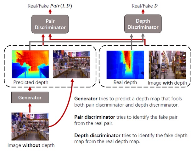 该论文提出了一种半监督对抗卷积神经网络框架 (Semi-Supervised Adversarial,简称为SSA),其目标在于建立有标签数据量很少的情况下如何充分利用大量无标签数据的方法。该方法提出在一个对抗训练的框架中,解除“图像对判别器”对真假样本必须为同一图像的要求,“真样本对”采用有标签数据的RGB图像以及对应的真实深度图,“伪样本对”采用无标签RGB图像以及用生成器网络预测出的深度图,由判别器网络区分预测出的深度图与对应RGB直接是否符合真实的联合概率分布,进而从无标签数据中收获监督信息。与此同时,通过添加“深度图判别器”,来约束预测的深度图与真实深度图的分布一致性。目前该方法运用在多个公开的深度估计数据集上,在标签数据有限时都取得了最好的评估结果。