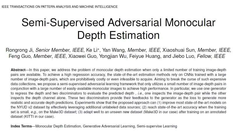 近日,人工智能领域顶级学术刊物IEEE Transactions on Pattern Analysis and Machine Intelligence(即IEEE TPAMI,影响因子17.730)接收了我校信息学院纪荣嵘团队的最新研究成果“Semi-Supervised Adversarial Monocular Depth Estimation”。