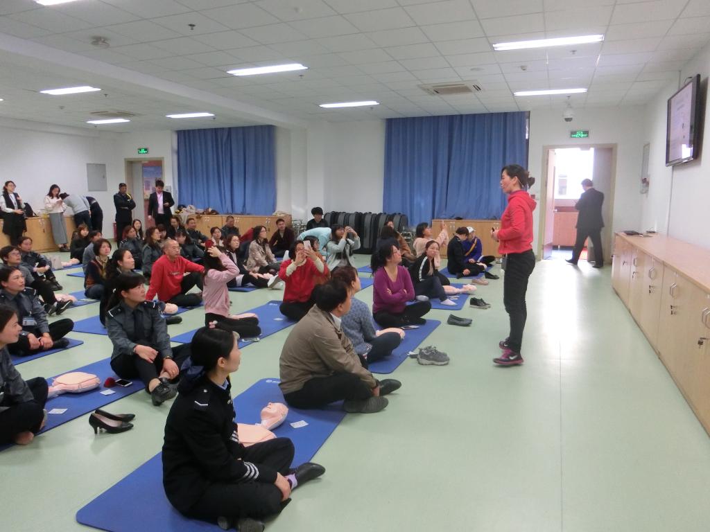 培训课上,沈老师用生动形象、图文并茂的PPT演示讲解了日常生活中出现的出血、烫伤、扭伤、低血糖、中暑、溺水等突发状况的处理办法,并用人体模型现场演示了“胸外按压”、“人工呼吸”的操作方法,指导参训学员逐一模拟操作,针对实践操作不规范的动作及时纠正和讲解,手把手进行辅导,使学员更直观有效地掌握急救技能。