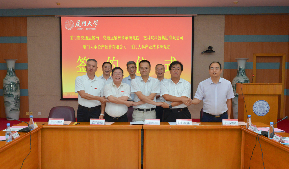 签约仪式上,厦门市交通运输局副局长师强、交通运输部科学研究院副院长王先进、交科院科技集团有限公司董事刘礼勇、厦门大学资产经营有限公司副总经理吴福武、厦门大学产业技术研究院院长沈小平共同签署五方战略合作协议,交通运输部科学研究院院长石宝林、厦门市交通运输局党工委书记、局长王文杰和我校校长助理张建霖共同见证。