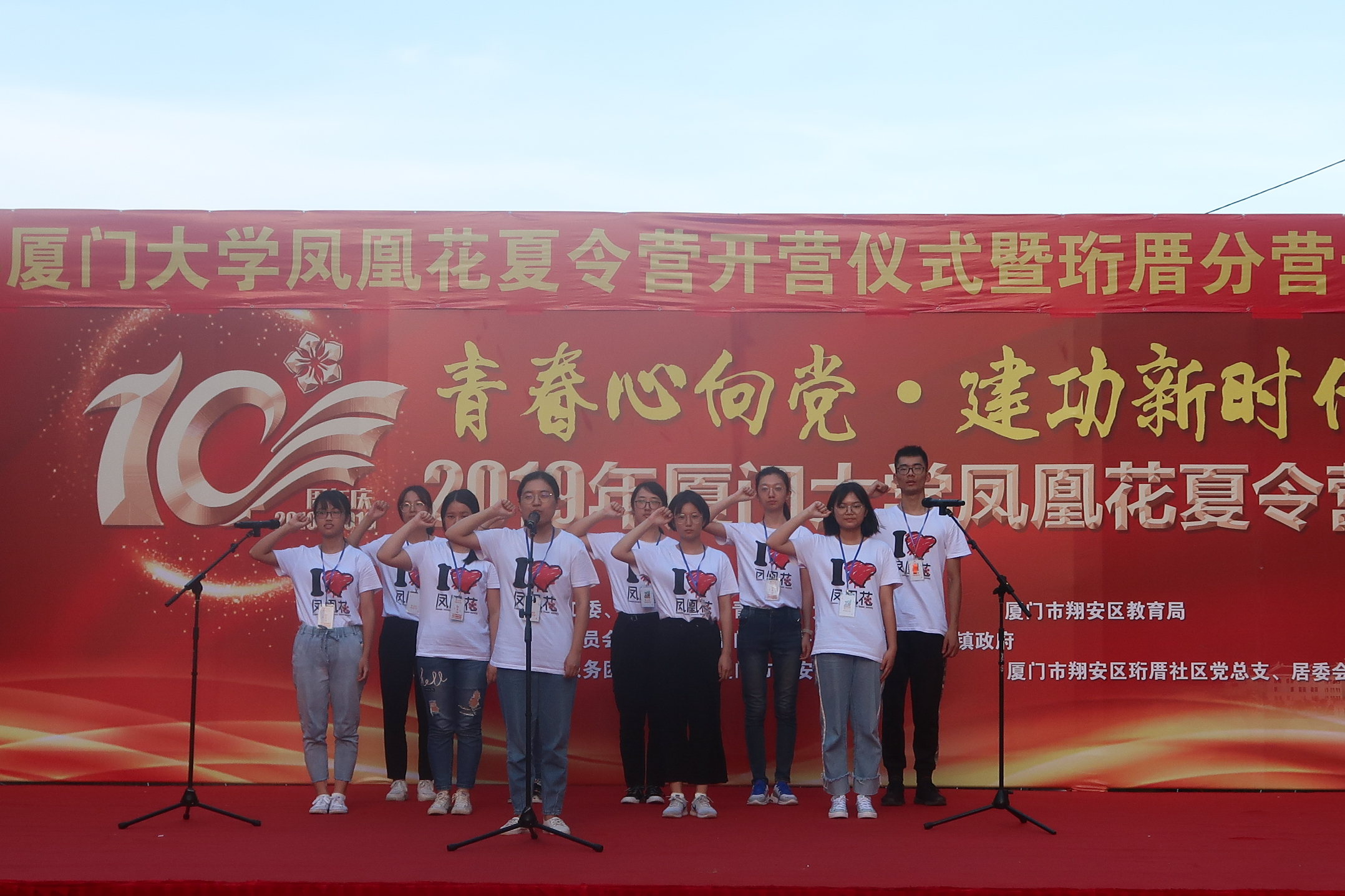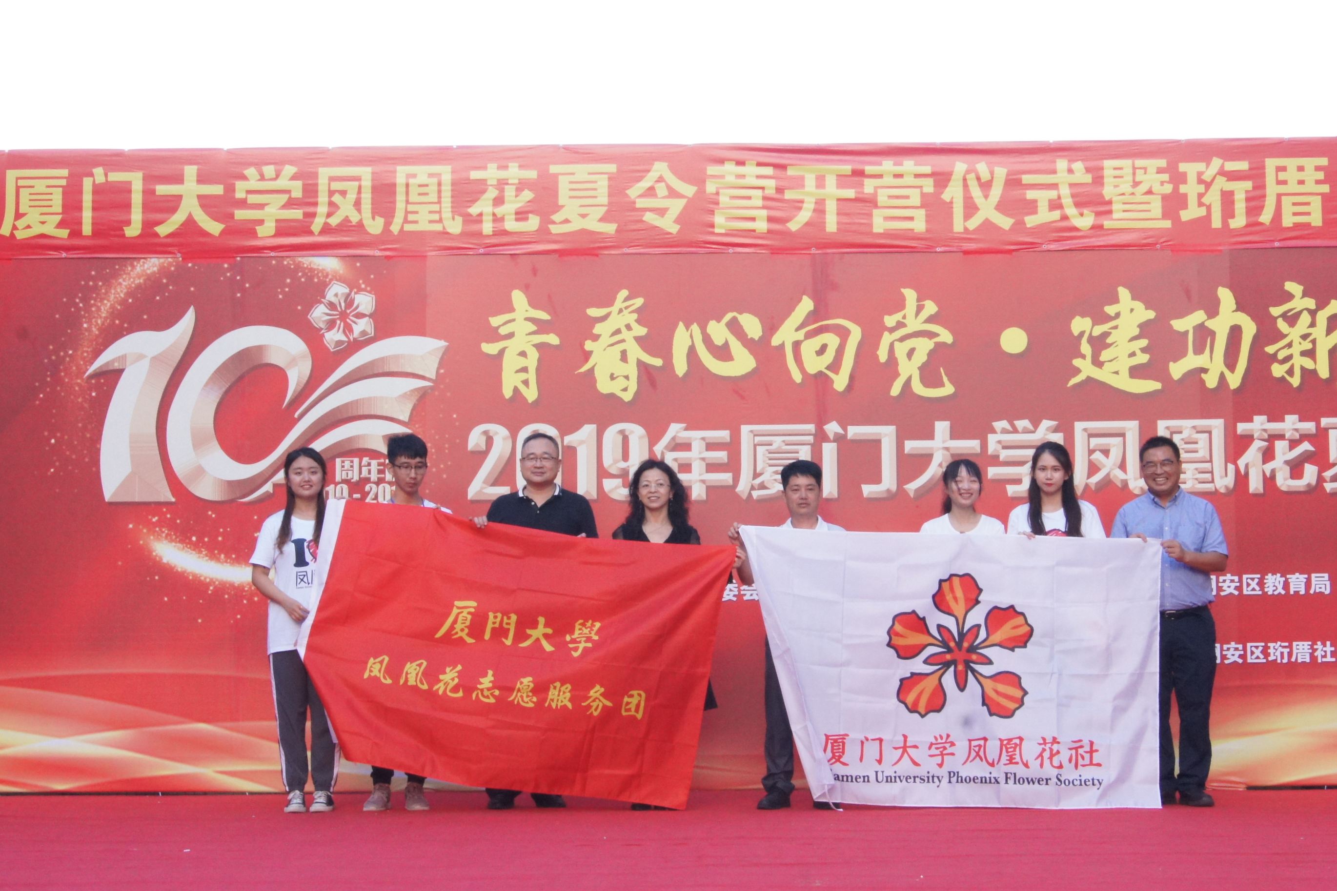 仪式上,厦门市翔安区新店镇党委副书记李峰泽宣布2019年凤凰花夏令营正式开营。翔安区教育局局长林佳跃和厦门大学翔安校区党工委副书记、管委会副主任黄宇霞共同为凤凰花服务志愿团志愿者授予志愿团团旗。厦门大学翔安校区学生办主任张清榕和厦门大学翔安校区办主任崔庆炜共同为凤凰花服务志愿团志愿者授予凤凰花社社旗。