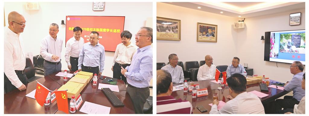 (陈国鹰校友观看读书时所用教材图书,并与母院领导、老师们座谈)
