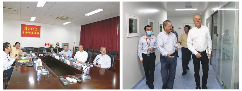 在药学院,院长张晓坤首先引导陈国鹰校友实地参观了厦门大学高通量药物筛选平台。药学院以发展具有自主知识产权原创新药为工作核心,瞄准国家人口与健康重大需求,专注于癌症等重大疾病的治疗药物原创性发现与创新性研究。该平台成立于2018年,是由医学与生命科学学部牵头、药学院承建的校级“双一流”重大项目。张晓坤还就生物医学研究院科研平台、教育部“核受体肿瘤分子靶点与药物开发”创新团队总体情况做了重点分享。