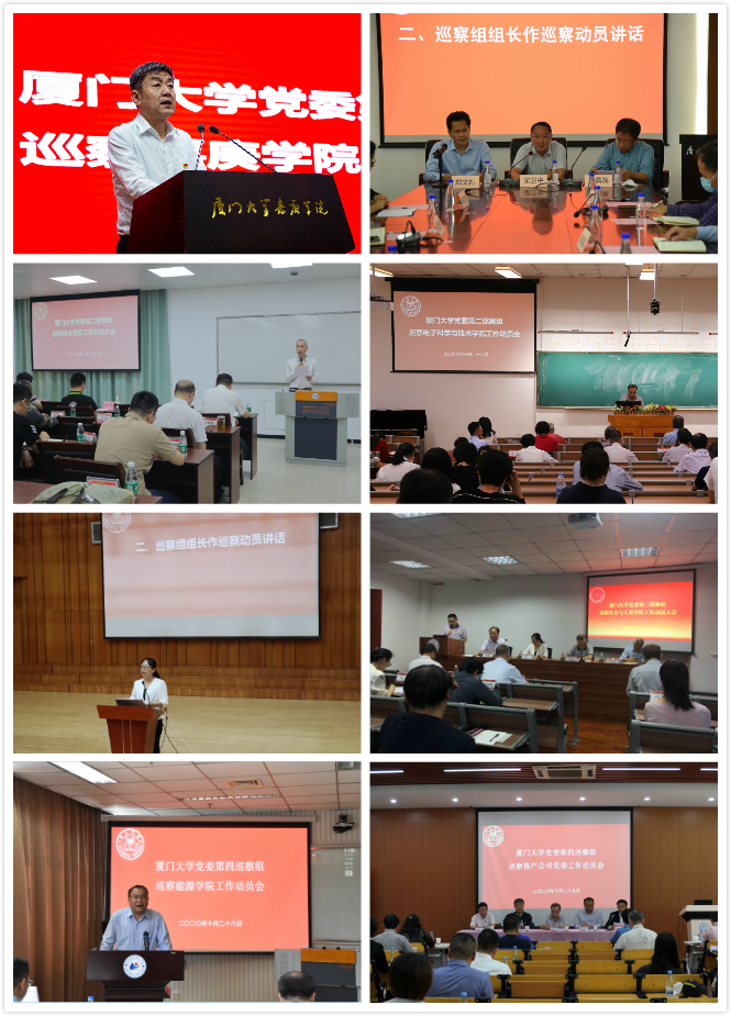 本轮巡察对嘉庚学院、出版社、信息学院、电子科学与技术学院、艺术学院、社会与人类学院、能源学院、资产经营有限公司8个基层党委(党总支)开展常规巡察。近日,8个被巡察单位分别召开巡察动员大会。会前,被巡察单位党组织负责人宣读常态化疫情防控《大会安全要求》。会上,由巡察组组长作动员讲话,传达巡视巡察工作最新精神,明确本轮巡察重点任务和总体安排;巡察办负责人提出工作要求;被巡察单位党组织主要负责人作表态发言;会议同时对党政领导班子和班子成员进行线上民主测评。