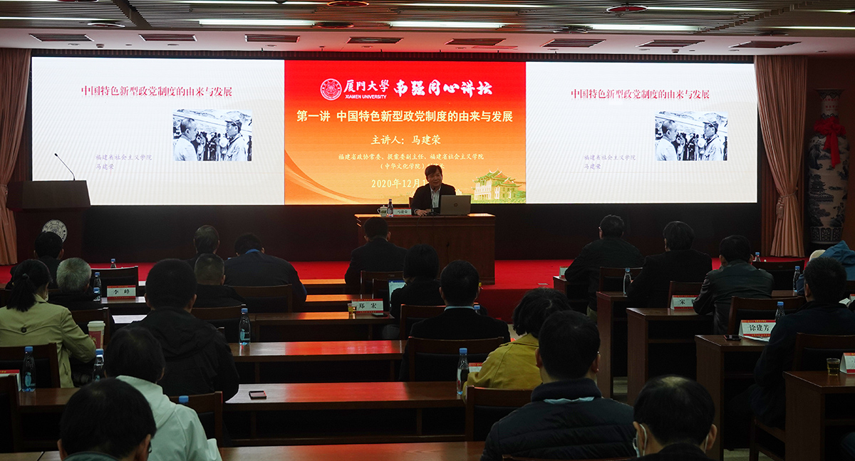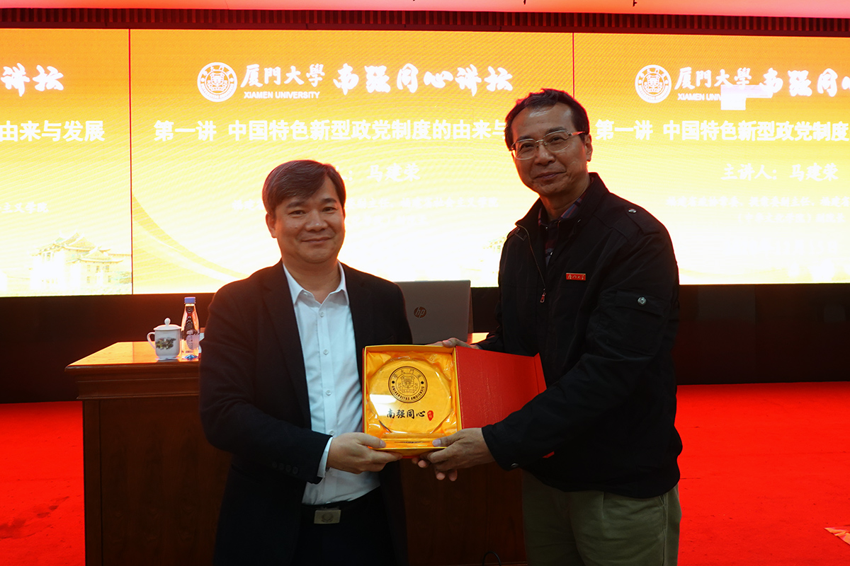 为深入学习习近平新时代中国特色社会主义思想,贯彻落实中共十九届五中全会精神,巩固政治共识、践行同心理念、凝聚智慧力量,本学期,校党委举办“南强同心讲坛”,12月15日下午,首场讲座在科学艺术中心举行。福建省社会主义学院副院长马建荣应邀作《中国新型政党制度的由来与发展》讲座。校党委副书记赖虹凯出席并代表学校向马建荣颁授“南强同心讲坛”纪念牌。