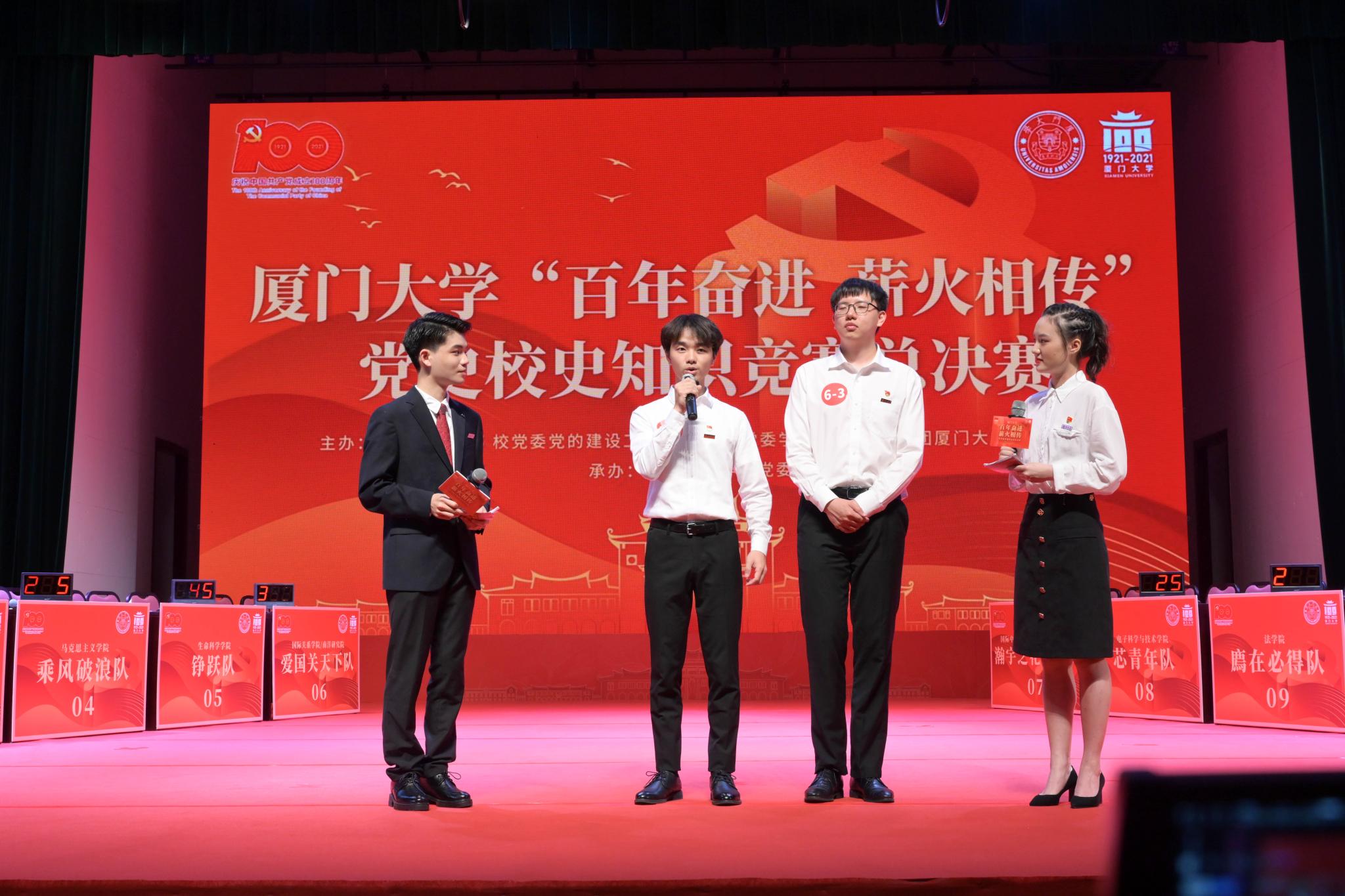 竞赛结合党史学习教育,以弘扬嘉庚精神、奋进百年新征程为主要内容,通过学习、宣传和竞赛,深化学生对党史、校史的认识和理解,引导广大学子学史明理、学史增信、学史崇德、学史力行,做到学党史、悟思想、办实事、开新局,以实际行动和优异成绩献礼建党百年和建校百年。比赛于今年四月火热开赛,经过线上答题初试、校级笔试选拔,团队积分排名前十二名的队伍进入总决赛。为进一步创新比赛形式,今年的决赛现场还邀请了四位厦门大学“扬才计划”学生党支部书记培训班的学员在现场进行党史校史主题的微党课演讲,并将竞赛题目融入微党课内容之中,选手们需要在听完演讲后作答。三组微党课分别以《纪念罗扬才烈士》《闽宁协作,海誓山盟·精准脱贫》《扬帆“嘉庚”号,驶向海洋强国梦》为主题,将党史和校史穿插其中,既增加了比赛的趣味性,又在潜移默化中提升了育人成效。