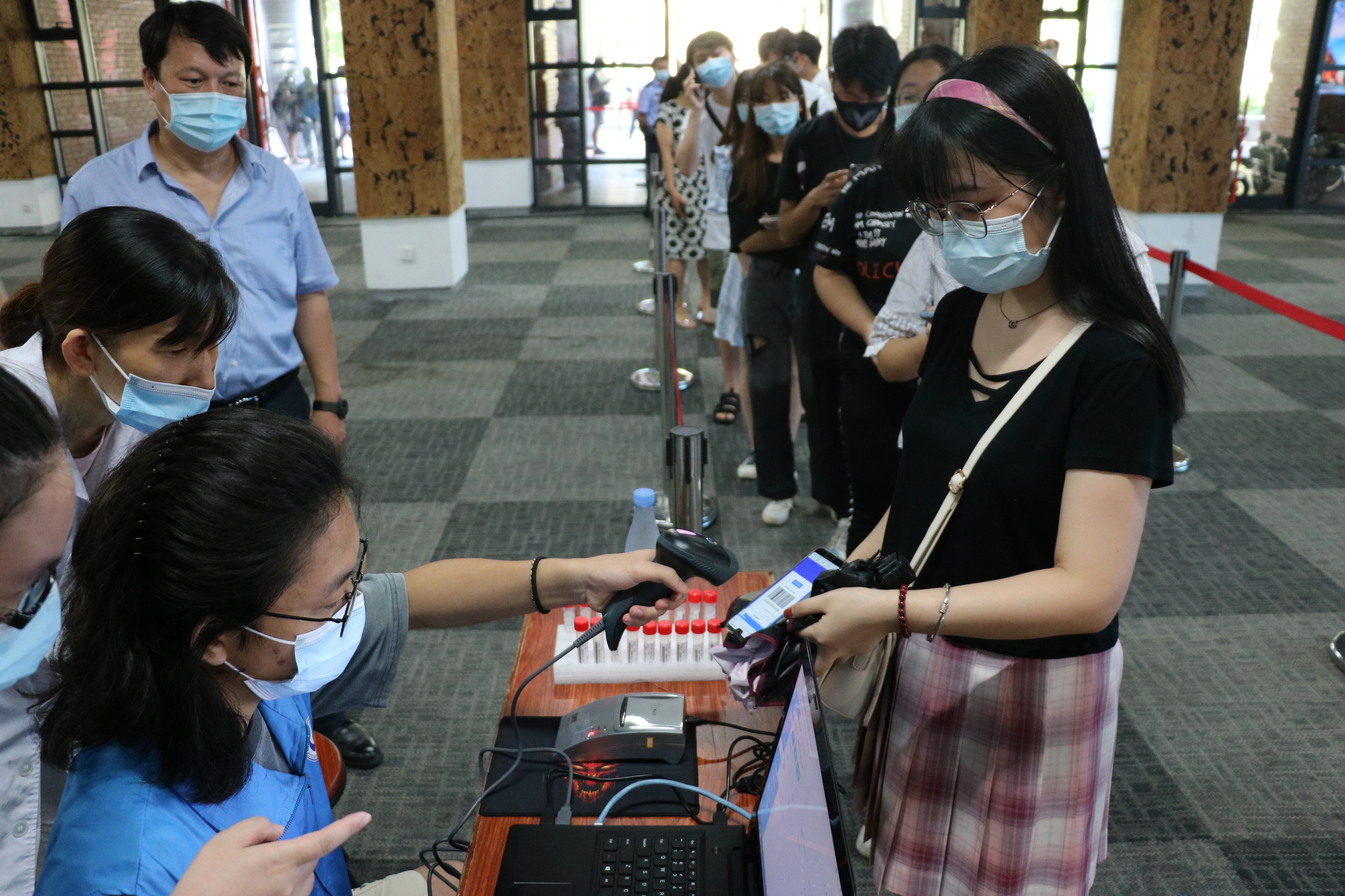 本次演练模拟校园出现核酸检测阳性病例,第一时间启动校园封闭和全员核酸检测的应急处置流程,同时结合迎新工作,分别在大南校门、群贤校门、白城校门、访客中心、法学院、东区、思源谷等地开展迎新专项实景演练。