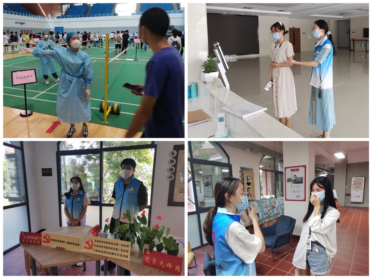 一名党员就是一面旗帜,越是情况危急,越需要广大党员发挥先锋模范作用,让“党旗红”高高飘扬在疫情战线。为了加强学院大楼出入人员管理,学院于院楼各门岗处设立“党员先锋岗”,各师生党支部党员轮班值守,协助管理人员做好人员出入权限核实与登记。学生宿舍园区设立疫情防控党员督导岗,安排党员定期值班,对往来园区的师生进行体温检测和行为督导。师生党员志愿者共同清理学生社区并进行定时消杀,设立预约制度对“一站式”学生社区实施规范化管理,确保学生在学生社区学习时全程佩戴口罩,一人一桌,保持合理距离。师生踊跃报名校区核酸检测志愿者、食堂测温督导志愿者,在校区核酸检测工作、日常工作运转中践行“战疫有我”的使命担当。此刻,“党员红”化身为“志愿蓝”,生命科学学院师生党员志愿者的身影定格在校园的各个角落。
