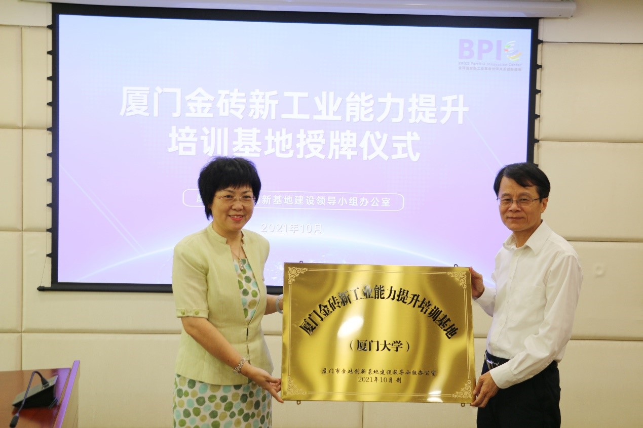 习近平总书记在金砖国家领导人第十二次会晤中宣布,在厦门建立金砖国家新工业革命伙伴关系创新基地,将福建省特别是厦门市产业发展和人才培养深度融入到世界经济格局之中。10月20日,厦门市举行“厦门金砖新工业能力提升培训基地联盟”授牌仪式,厦门市副市长黄晓舟出席仪式并为首批基地单位授牌。厦门大学成为首批获授牌成员单位之一,邓朝晖副校长代表厦大接受授牌。