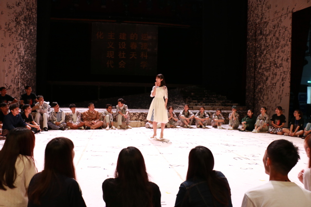 演出结束后,《哥德巴赫猜想》剧组演职人员还与澳门大学的同学们展开交流。他们在大学会堂的舞台上席地而坐、围成一圈,有的走到舞台中央表演才艺,有的分享自己的演出经验,有的则积极提出两校间学习、活动等问题。交流现场充满欢声笑语,掌声不断。他们还向对方发出诚挚邀约,希望以后能有更多机会加深交往与互动。