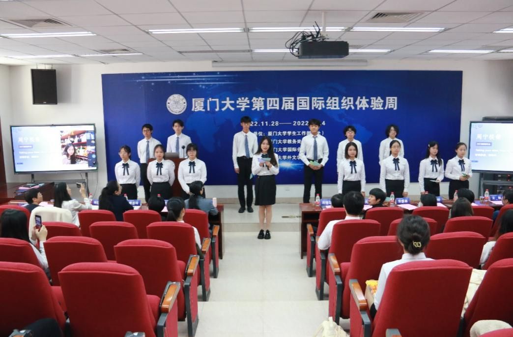厦门大学国际组织体验周由厦门大学学生工作(部)处、教务处、国际合作与交流处主办,外文学院承办,目前已成功举办四届,旨在帮助学生进一步了解国际组织、开拓国际视野、提高核心能力,为有志于从事国际组织工作的学子们提供一个储备知识、磨练技能、交流思想的综合平台,为传播国际组织的“中国声音”培养高质量人才。